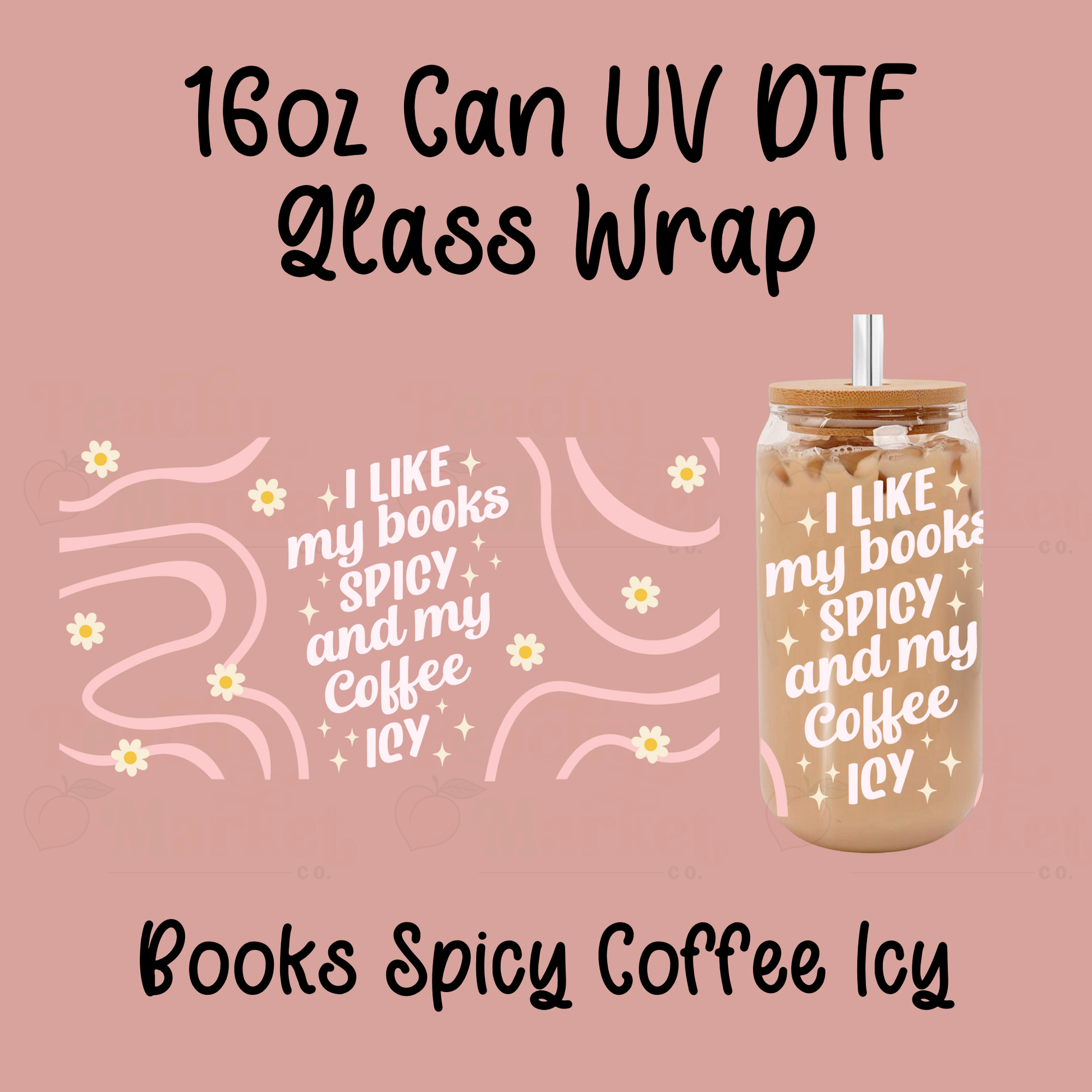 Books Spicy Coffee Icy White Text 16oz Can Glass Wrap UV DTF
