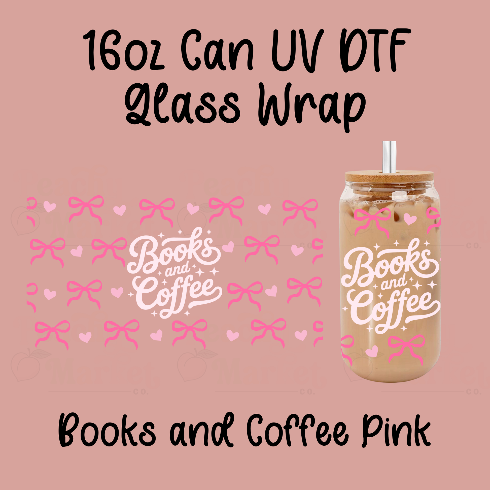 1 – Books and Coffee Pink 16oz Can Glass Wrap UV DTF