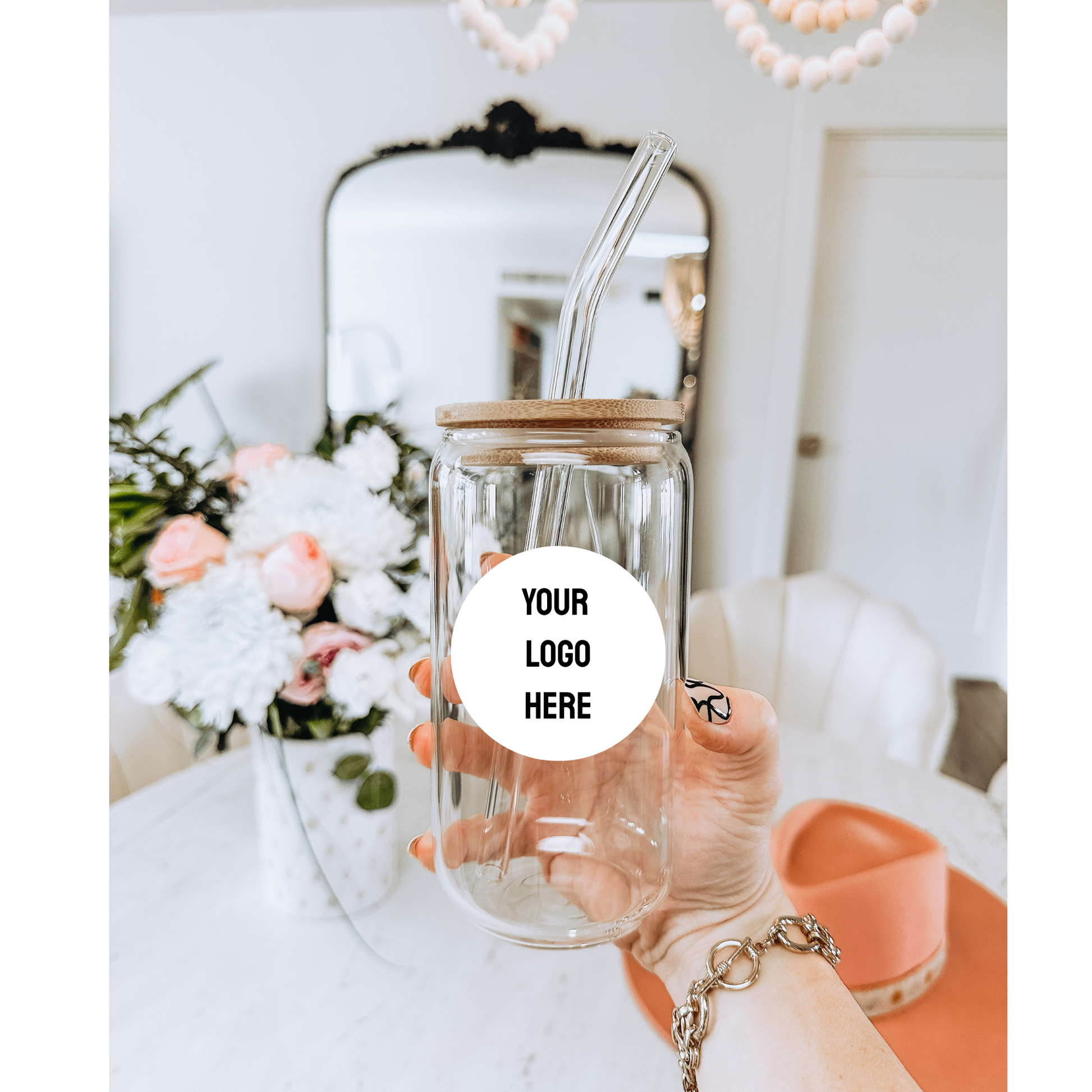 1 – Custom Design or Logo16oz Can Glass with bamboo lid and glass straw